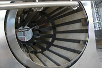 由電機(jī)帶動中間軸上的鏈輪旋轉(zhuǎn)從而帶動滾筒的旋轉(zhuǎn),滾筒上有三個(gè)大法蘭,由六個(gè)托輪支撐,滾筒速度可由電機(jī)作調(diào)整。滾筒內(nèi)壁裝有導(dǎo)料長條,滾筒內(nèi)有噴淋水管,下方有兩個(gè)水箱,進(jìn)料方噴淋管的水來自出料邊水箱,此水采用循環(huán)水;出料處的噴淋水來自進(jìn)料邊的水箱,此水是清水。
